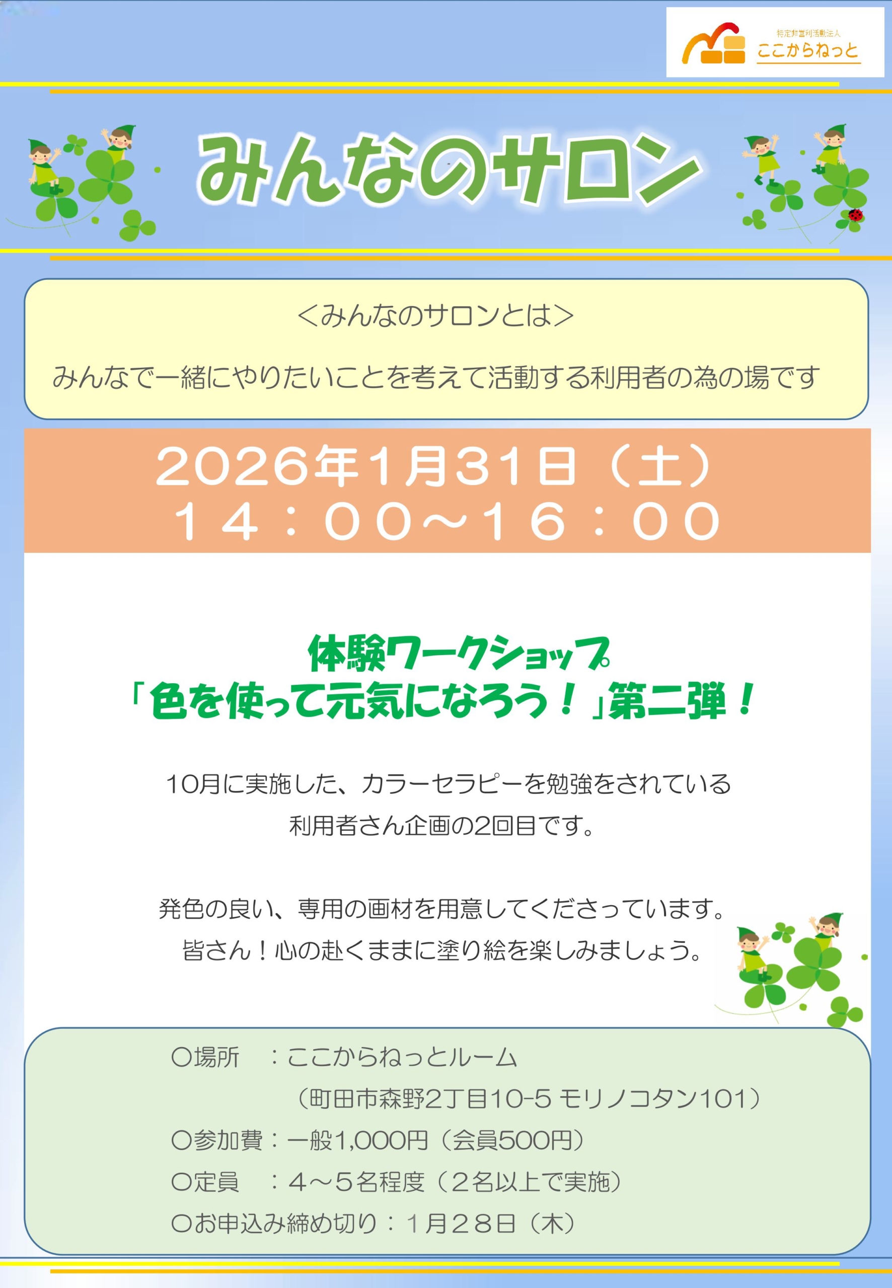 | みんなのサロンとは みんなで一緒にやりたいことを考えて 活動する利用者さんの為の場です。 自分のできること、やりたいこと一緒に探してみませんか みんなのサロンチラシ ![]() ダウンロードはこちら ※これまでのみんなのサロンの活動内容は こちらからご覧いただけます。 | 体験ワークショップ「色を使って元気になろう!」第二弾! 10月に実施した、カラーセラピーの勉強をされている利用者さん企画の2回目です。 発色の良い、専用の画材を用意してくださっています。 皆さん、心の赴くままに塗り絵を楽しみましょう。 ○場所:ここからねっとルーム (町田市森野2丁目10-5 モリノコタン101) ○参加費:一般1,000円(会員500円) 〇定員:4~5名程度(2名以上で実施) 〇締め切り:1月29日(木) |